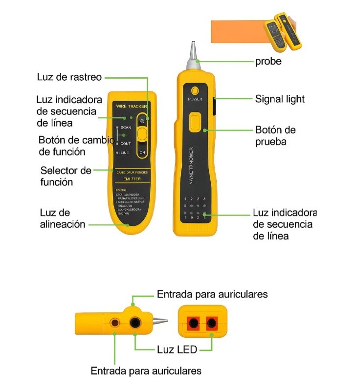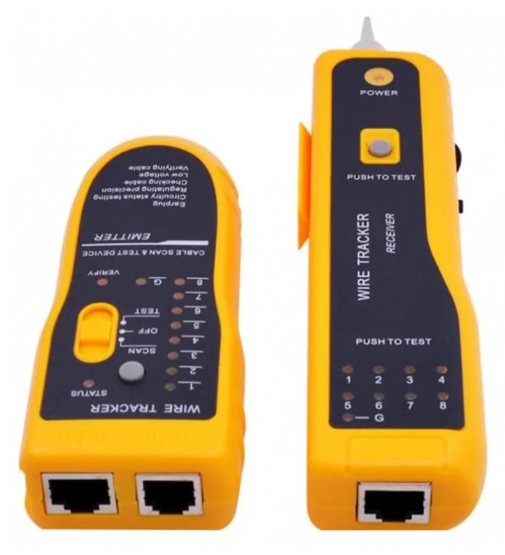 TESTER PARA CABLE DE REDES, 1 unidad principal y 1 remota, RJ45 + RJ11, incluye funda. Alimentación 1 batería 9V (no Incluida), Forma: NS468