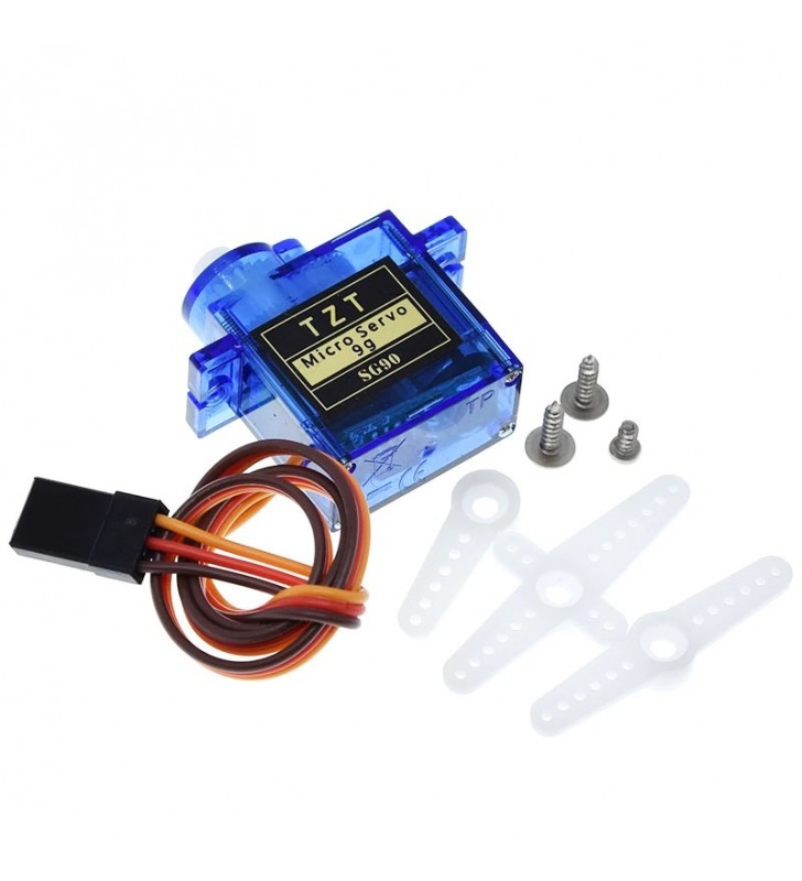 MOTOR MICRO SERVO ANALOGO, Rotación 180° app, vel 0.12 sec/60° @ 4.8V, Torque: 1.2 a 1.4 Kg/cm @ 4.8V, Voltaje de funcionamiento: 4.8V a 6V, peso 9g, Forma: SG90