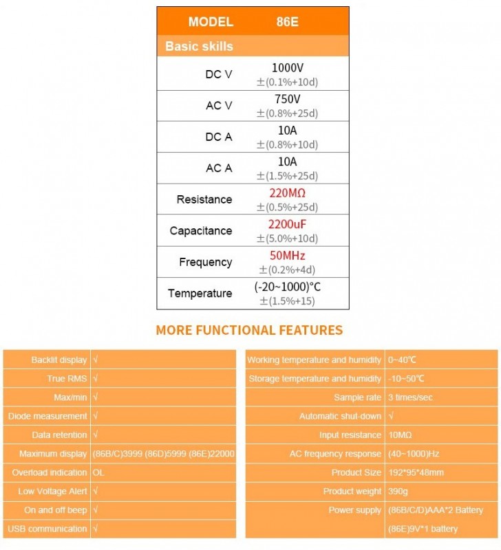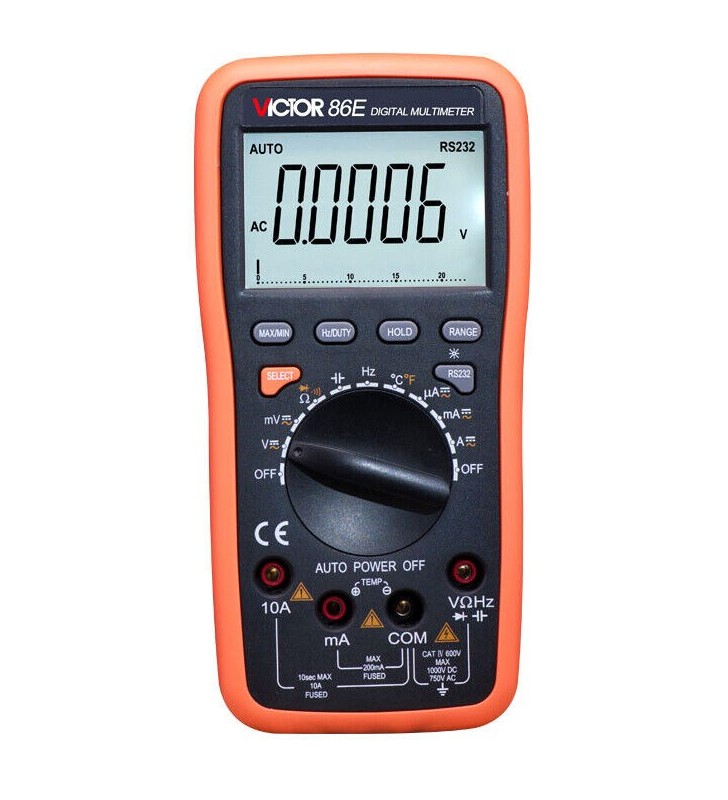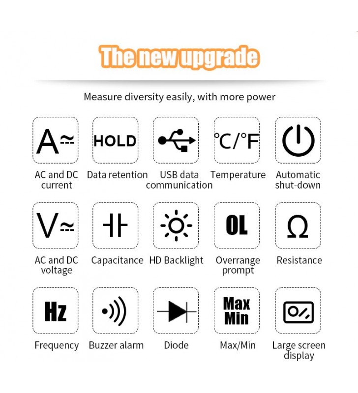 MULTIMETRO DE TENAZA TRUE RMS AC 60A/600A, DC 60A/600A, VDC 600mV/6V/600V, VAC 6V/60V/600V, RESISTENCIA 600 ohms - 60M ohms, CAPACIDAD 60nF - 6 mili Faradios, TEMPERATURA -20°C a 1000°C, DIODOS, FRECUENCIA 10 Hz-10MHz, CICLO DE TRABAJO, LowZ 6/60/300V, Inrush, VFC. LINTERNA, Usa 2 pilas AAA (no incluidas), Apertura Mandíbula 35mm, Forma: 606C+