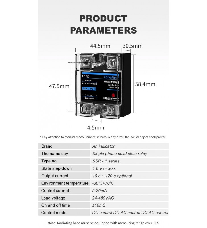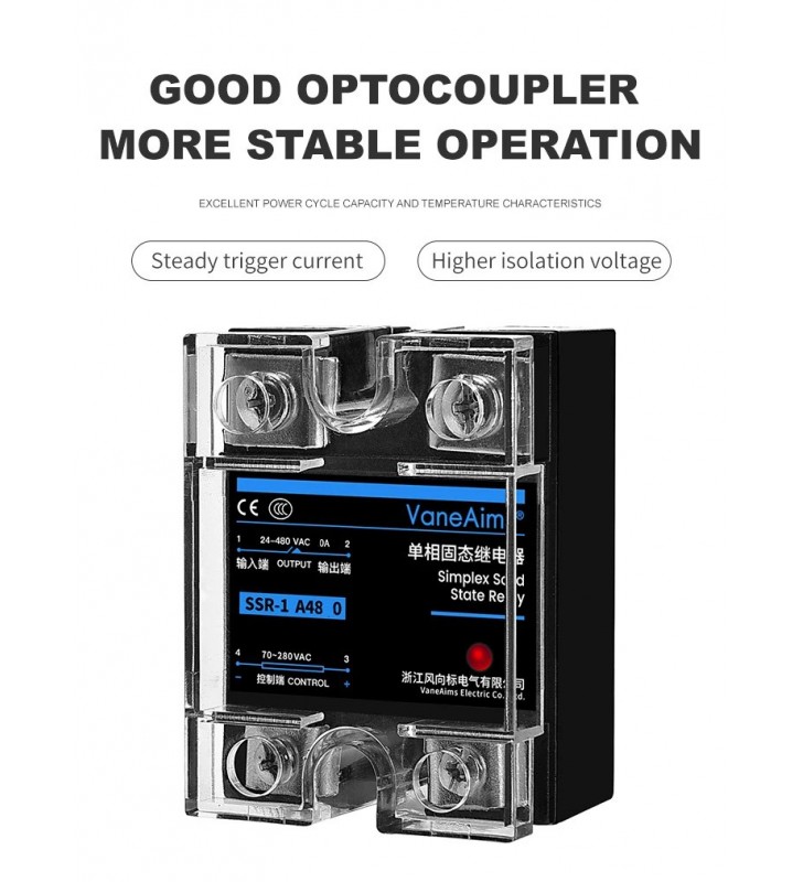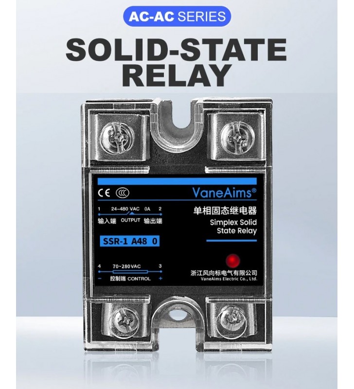 RELÉ DE ESTADO SOLIDO, MONOFÁSICO, I carga 80A, V carga 24 a 480VAC. V control 70 a 280VAC, I control 5 a 20mA, Tiempo ON-OFF <=10ms, Forma: SSR80AA