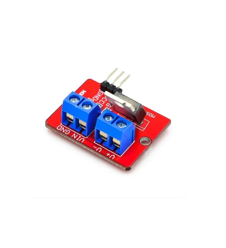 Este módulo es un Driver MOSFET digital que es utilizado para controlar elementos de mayor tensión y potencia. Puede ser usado como interruptor electrónico y para realizar control PWM. Algunas aplicaciones son: Atenuación, Partidores Suaves, Control de Velocidad en Motores DC, Tiras de LED’s, Válvulas, etc.